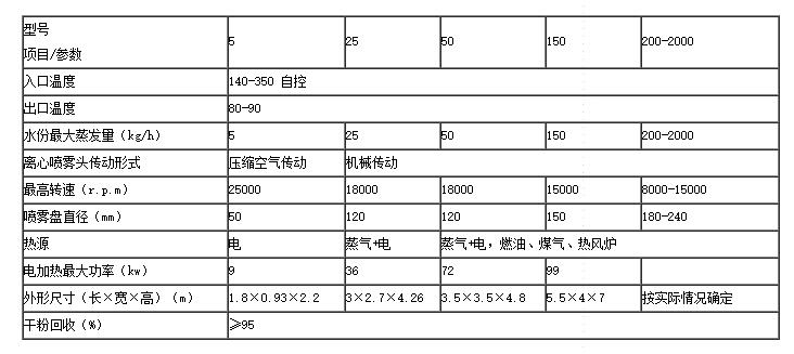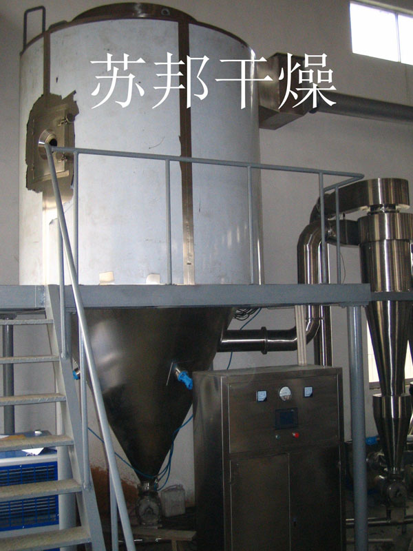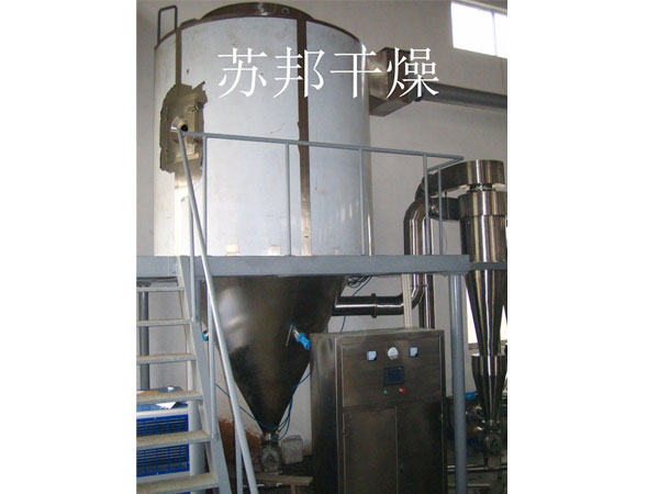 空氣經過濾和加熱,進入干燥器頂部空氣分配器,熱空氣呈螺旋狀均勻地進入干燥室。料液經塔體頂部的高速離心霧化器,(旋轉)噴霧成極細微的霧狀液珠,與熱空氣并流接觸在極短的時間內可干燥為成品。成品連續地由干燥塔底部和旋風分離器中輸出,廢氣由風機排空。